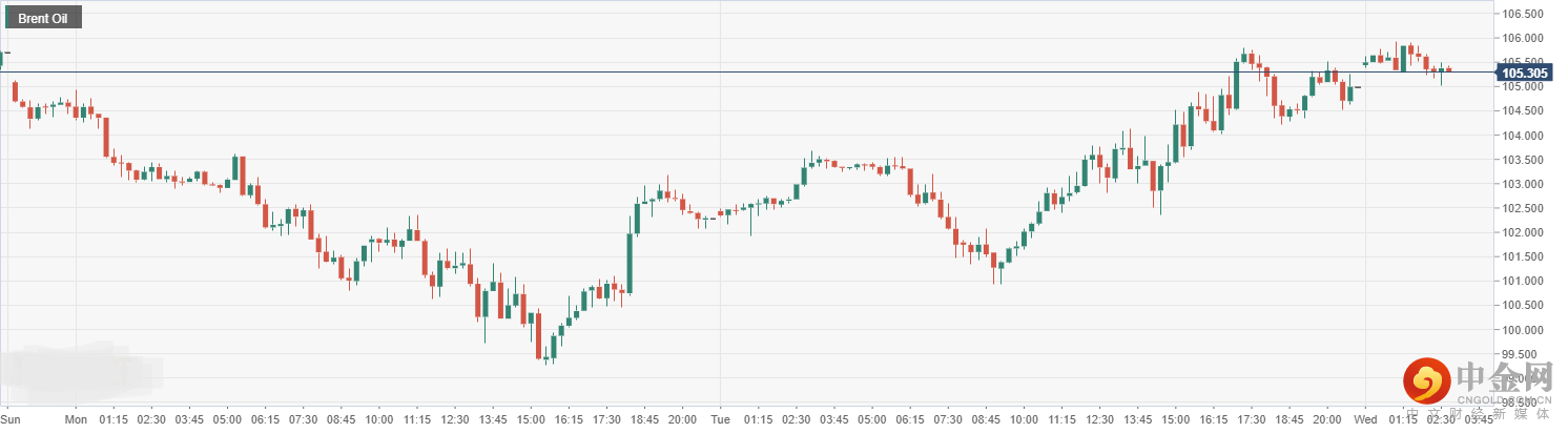 布伦特原油周二收盘大幅回升后,今日开盘涨至105.30附近,因俄罗斯与欧洲能源供应出现重大矛盾,伴随俄罗斯恐对乌动用核武风险升温,促使油价上行支撑提振。