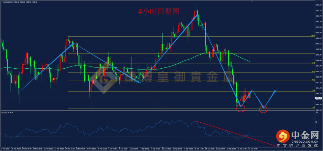 从黄金4小时周期看,黄金自触及本轮高点1998.0一线后出现快速杀跌,一度杀跌至大区间结构低点1890.0附近,在昨日出现企稳回升,但从目前来看,行情仍处于向下趋势当中,本周价格上方空间有限,今日触及上方1910.0一线仍有可能出现回踩,但短线来看1890.0一线支撑较强,回踩后反弹概率较大,目前4小时级别RSI趋势线已经向上突破,看涨信号出现,回踩可轻仓尝试多单。