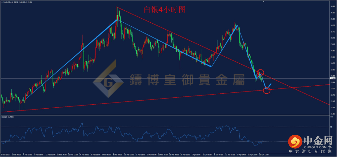 从4小时周期图看,自白银最高触及26.20高点后,价格单边快速杀跌,并在昨日跌破前期趋势线后反弹继续受阻,从整体结构上来看,目前白银仍处于下降趋势当中,但从RSI指标来看,白银超卖严重,指标数值触及18之后重新站上30一线,短期来看有超跌反弹可能。预计今日价格仍有可能在23.80一线受阻,但下方整数关口23.00一线将成为重要支撑,可轻仓尝试多单。