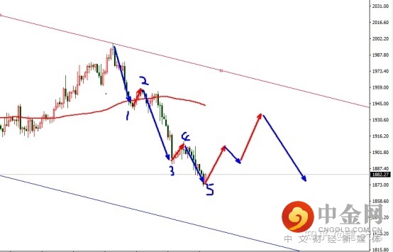黄金昨日欧盘虚破之后反弹前高附近1907继续破低下行,当下行情从结构上看,已经走完下跌五浪。