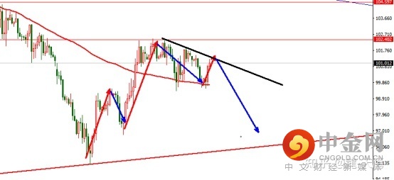 从趋势线上看今日的阻力位置是在101.2-3一线,下方支撑看80均线99.7位置,如跌破此位置,下方支撑98.5-97.6一线
