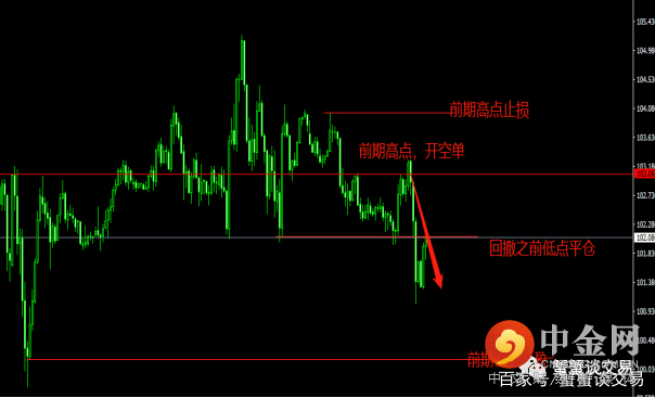 如上图15分钟原油大跌,空头趋势,行情反弹到前期高点,开空单,空单进场后,行情到了之前低点,会暂时持有空单,如行情没有跌破之前低点,行情如收阳线,空单平仓出局,跌破继续持有看前期低点。如行情没有触及前期低点触及止盈,反弹至之前高点,空单平仓。多单反之。