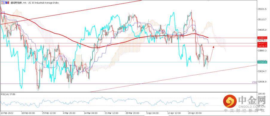 技术面来看,US30自4月25日至昨日交易日间,K线在4小时图上形成较高的高点与较低的低点的K线排列,表明行情目前除以震荡下跌趋势中。下方支撑位为昨日低点33100附近,如果多头能在该位置企稳,则短期内有望暂时性冲高测试34000-34150之间的压力区间。反之,若多头上涨动能不足并进一步跌破34000-34100,则空头或在未来数个交易日推低价格至32525附近。