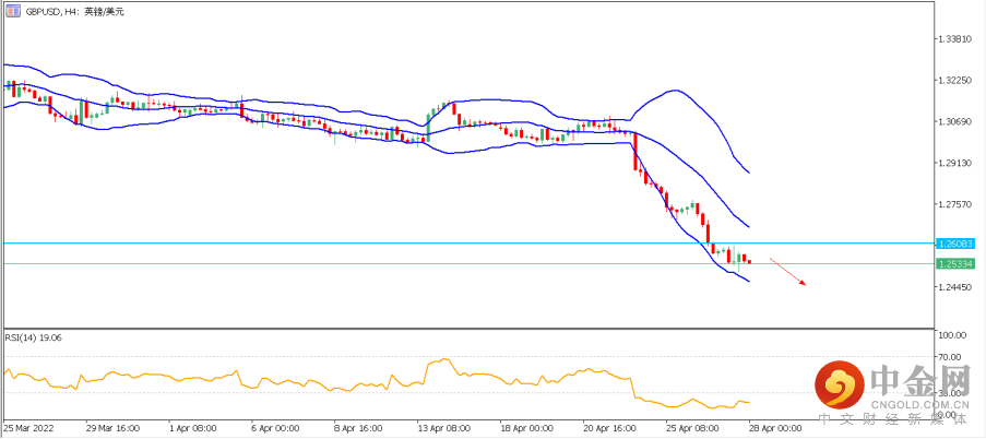 再结合4小时分图,与日图相一致,RSI在4小时图上也显示严重超卖,但也未有明显背离,总体镑美还是以看空为主。日内上方压力带可关注1.2580-1.2600区间,若价格运行于该压力带下方,则保持看空格局,下方潜在目标可先关注1.2460-1.2470区间,下破后,后市将继续下探至1.2350一线。请注意,短期镑美只有站上1.2650一线后,跌势才可能会得到一定缓解。