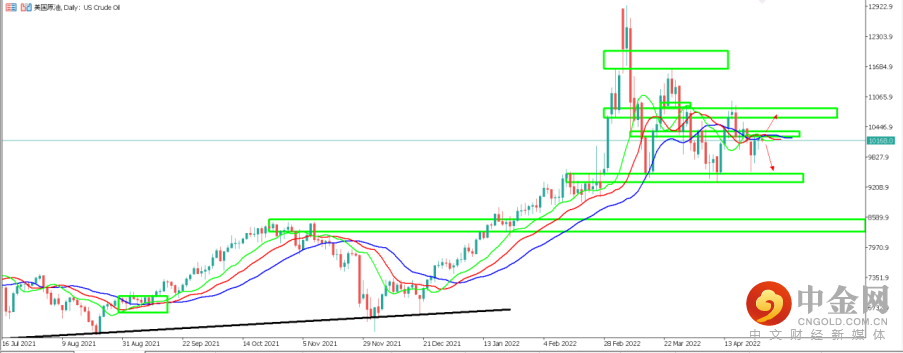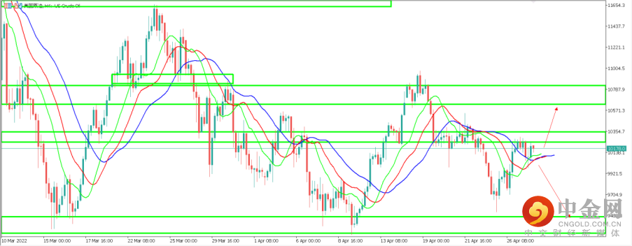 2.美国原油 USOIL:美油这边昨天盘中下跌后在收盘时收复失地,天图K线形成了下影线较长的吊线形态。从天图周期来看,目前鳄鱼指标已经几乎走平,价格也来到鳄鱼指标3条均线处。天图阻力区间位于103美元附近,如价格短期能够站上该区间,有望继续反弹测试上方107附近阻力。反之如价格被103附近阻力压制,则可能再次下跌至94美元支撑区间。从4小时周期来看,目前价格似乎重新站上鳄鱼指标之上,并且快线向上穿越逐步形成多头排列之势,如价格确认站上4小时鳄鱼指标,则短期走势较为乐观,反之如价格跌落鳄鱼指标均线,则短期可能继续跌势。目前价格正位于101.78美元一线附近运行。