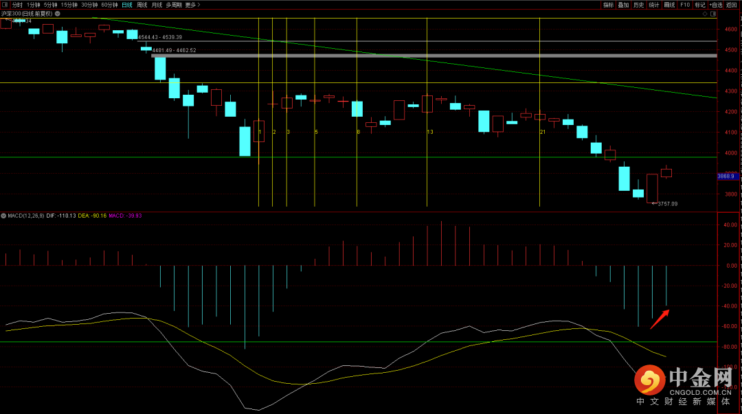 沪深300短期关注日线的macd是否持续收缩,只要能够构筑日线底背驰结构将有望迎来一段反弹走势。根据斐波拉契数列下一个变盘点有望出现在五一过后。