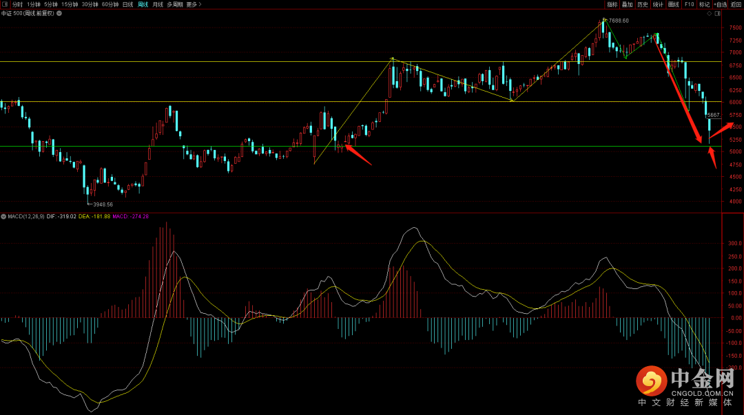 中证500虽然短期的下跌还没有走完,但从周线看这个位置大概率已经到达末端了,注意把控好低吸节奏点,大概率会有一段反抽走势出现。注意关注上方的周线跳空缺口,大概率会出现回补走势。