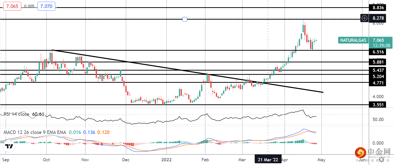 从 8.202 水平回落,天然气价格在 6.516 水平获得强劲支撑。随着动能指标从低点走高,虽然该支撑位保持不变,但近期关注的焦点是继续走高。在 6.516 下方,下一个需要注意的关键支撑位是 5.881 水平。