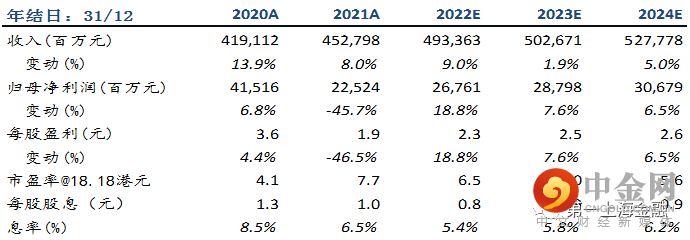 公司提出将坚持稳健经营和健康的财务状况、开发业务止跌回升、经营服务业务提升经营效率和竞争力作为2022年行动计划。我们认为,公司作为第一梯队的行业领先地产开发商,多年来在运营管理,尤其是财务管理上的审慎和稳健的优势有望在房地产行业风险的情况下率先走出困境,成功穿越周期。同时,公司的多元化业务符合地产行业进入存量市场的发展趋势,经过多年耕耘并取得高质量发展,有望为公司带来新的盈利增长点。我们预计公司2021-2023年实现归母净利润约268亿元/288亿元/307亿元,给予2022年9倍市盈率,目标价26.00港元,买入评级。