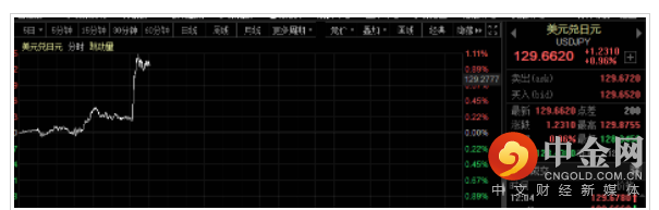4月28日,日本央行公布利率决议及声明后,美元兑日元直线拉升至129.5上方,日内涨超1%,刷新2002年以来新高。