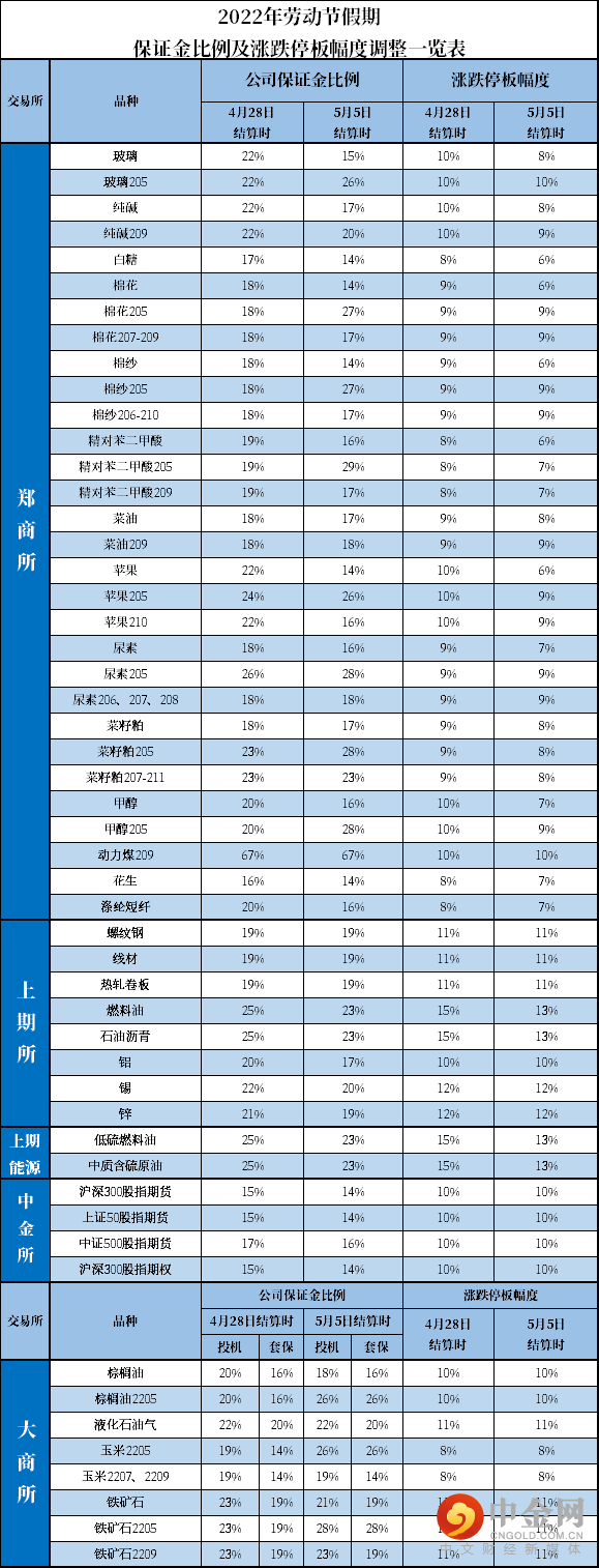 4、郑商所、上期所、大商所自5月5日恢复交易后,部分品种交易保证金标准和涨跌停板幅度将进行调整(具体详见表格)。