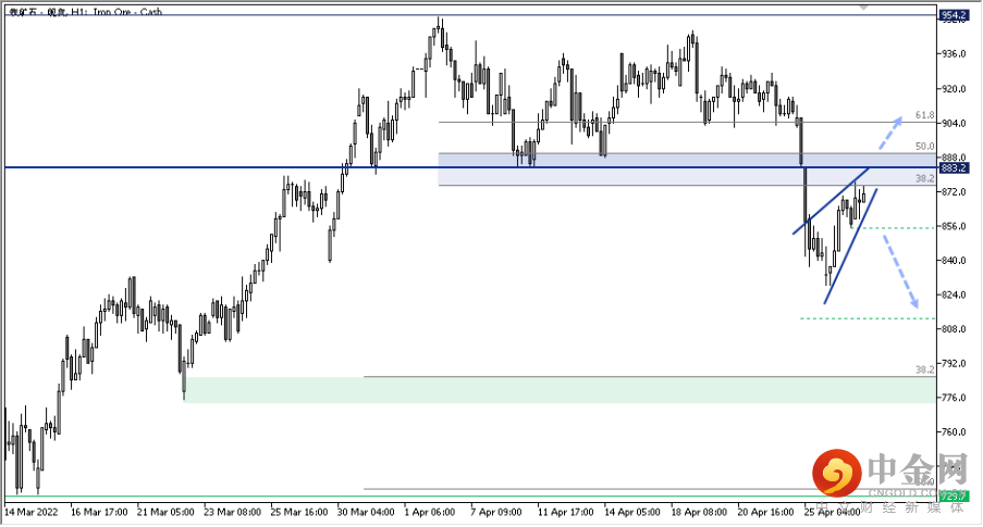 我们可以在铁矿石价格小时图上看到,昨天的高点落在38.2%回档位,就在883.2下方不远处。而昨天的反弹动能也弱于预期,表明看涨势能正在减弱。价格目前正于潜在上升楔形形态内向上盘整。