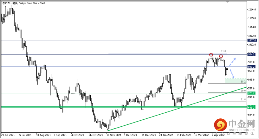 铁矿石价格周一下破883.2支撑位并确认双顶形态,如果该形态成立,目标在813附近。但价格昨天尝试反击883.2,所以该位依然是值得重点关注的水平。