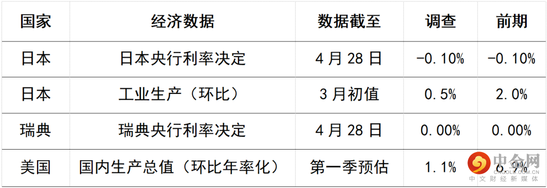 日本央行可能在4月27-28日的会议上维持货币政策不变。日本央行亦将公布季度展望报告,预期当局将下调增长预测,并上调通胀预测。其他值得留意的公布包括日元贬值相关经济影响的额外分析。数据方面,日本3月份工业生产可能升0.5%(环比),低于2月份的2.0%(环比),这反映了3月16日地震令生产线短暂停工的影响。