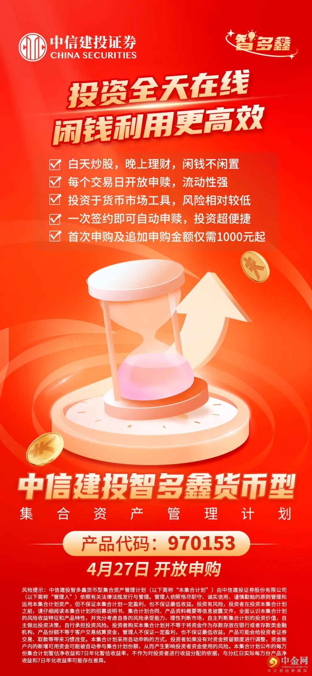 风险较低、门槛亲民,让理财更省心!签约便捷,自动投理财,让余额不再闲置!中信建投智多鑫货币型集合资产管理计划(代码:970153)于2022年4月27日起正式发售,欢迎关注!
