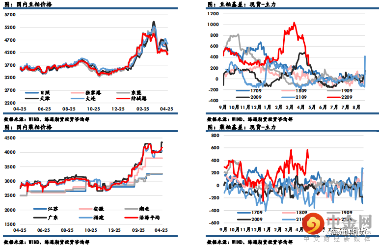 豆粕主力收盘报4001元,涨19元,涨幅0.48%,菜粕主力报收3728元,涨84元,涨幅2.31%。沿海区域油厂主流报价在4180-4350元/吨,广东4180涨20元/吨,江苏4280跌20元/吨,山东4280跌30元/吨,天津4350跌20元/吨。美豆维持震荡走势,菜粕重回强势,豆粕相对偏弱,豆油走强压制粕类价格。南美大豆减产令进口大豆理论成本维持高位,为修复全球供应紧张情况,需要依赖美豆春播顺利,因此市场将更加关注美豆生长及产区天气状况。美国中西部湿冷的天气导致大豆播种进度放缓。国内两粕基本面表现弱于外盘,当前正处于巴西大豆集中到港期,市场预计进口大豆陆续到港叠加政策性进口大豆拍卖将缓解此前大豆供应短缺问题。受油厂开机率回升预期影响,豆粕现货价格将有所承压,豆粕基差回落明显。