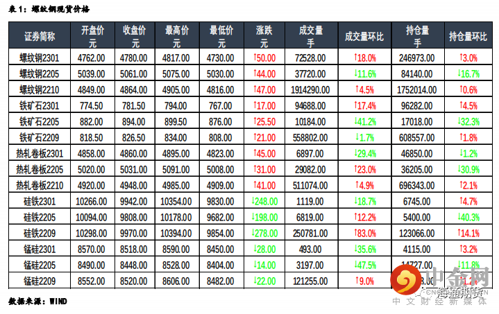 钢材:今日主力合约震荡上行,上海螺纹上涨 10 元/吨至 4990 元/吨,上海热卷上涨 30 元/吨至 5000 元/吨。螺纹 10 合约,永安期货买单持仓减少4091 手,卖单持仓减少 9506 手;前二十名期货公司买单持仓减少 11712手,卖单持仓增加 20013 手。钢联数据显示,4 月 26 全国建材成交量合计18.8 万吨、环比增加,高于上周的成交量均值 16.4 万吨。钢谷数据显示,全国建材产量环比增加 9.37 万吨至 457.82 万吨,社库环比降低33.5 万吨至 1186.98 万吨,厂库环比增加 15.13 万吨至 508.89 万吨,建材表观需求环比小幅增加 3.2 万吨至 476.19 万吨、大幅低于去年同期水平,疫情扰动对运输的负面影响导致钢厂去库不畅,成材需求仍受压制。供给方面,唐山市部分地区解除临时静态管理状态,但当前成材利润处于同期偏低水平,叠加粗钢产量平控今年将继续执行,因此供给端扰动较多,需持续关注。在近期原料端跌幅较大的影响下,成本支撑塌陷,导致此前成材盘面走势较弱。短期来看,宏观政策支持作用到下游存在时滞,地产端数据仍较为疲软,疫情扰动下游需求、物流运输均受严重负面影响,压制成材现货价格走势,需观察后市疫情动向以及成材供需的具体情况,预计在空头情绪释放后短期盘面将呈震荡走势。