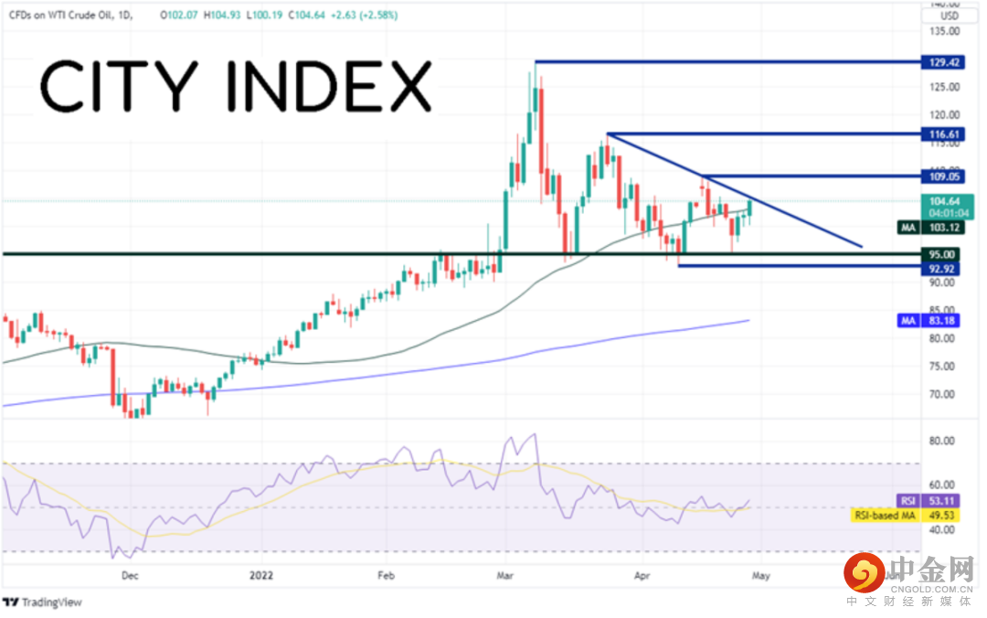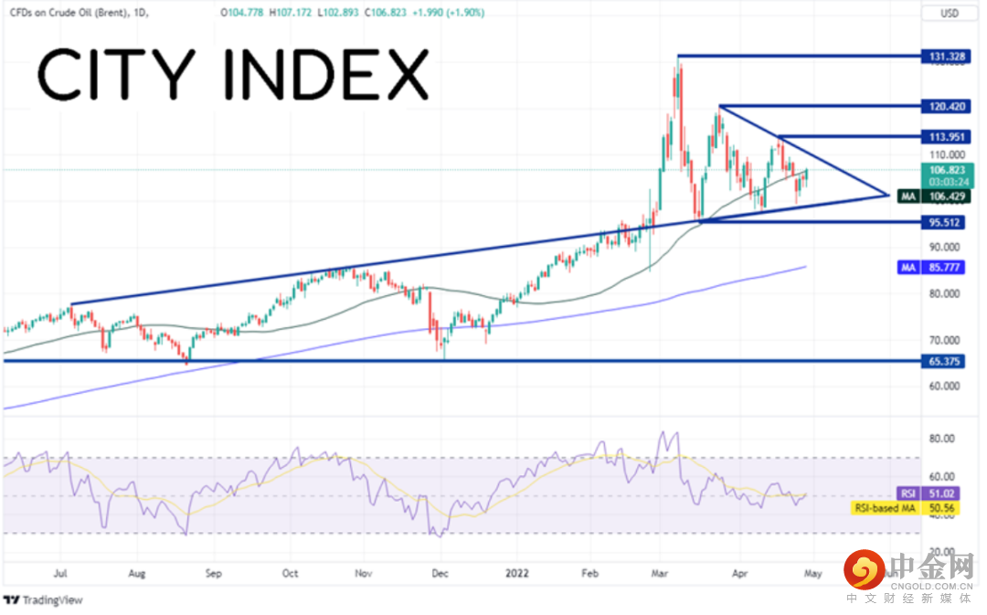 欧盟准备禁运俄罗斯原油,油价因此大涨。如果西得州原油和布伦特原油可以双双击穿各自的三角形,有望打开上行空间。