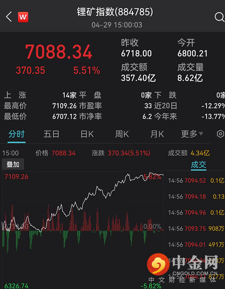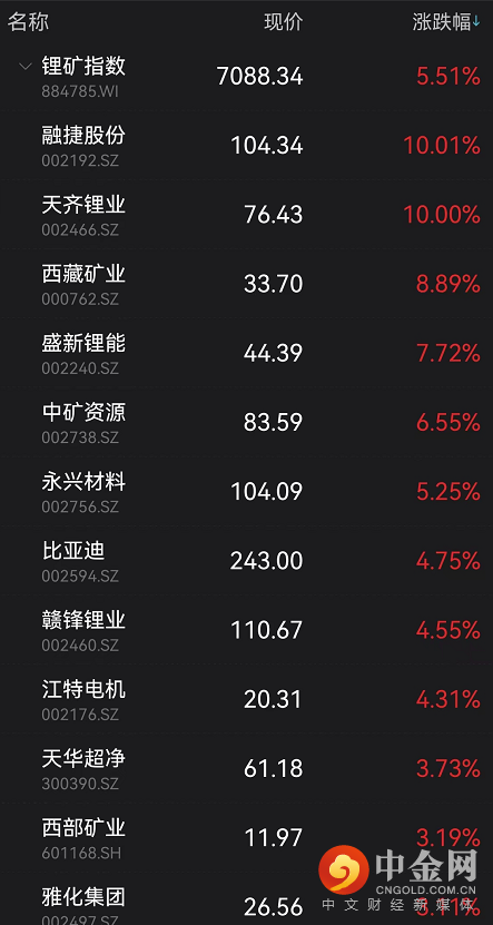 其中,锂矿板块午后延续强势,指数涨超5.5%,融捷股份三连板,股价重返百元上方,
