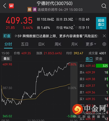 宁德时代涨近6%,股价重回400元关口至409元。