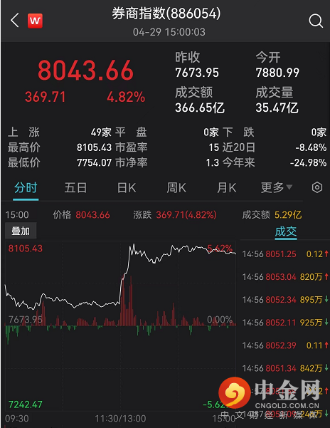 券商指数也持续攀升,指数收涨4.82%。