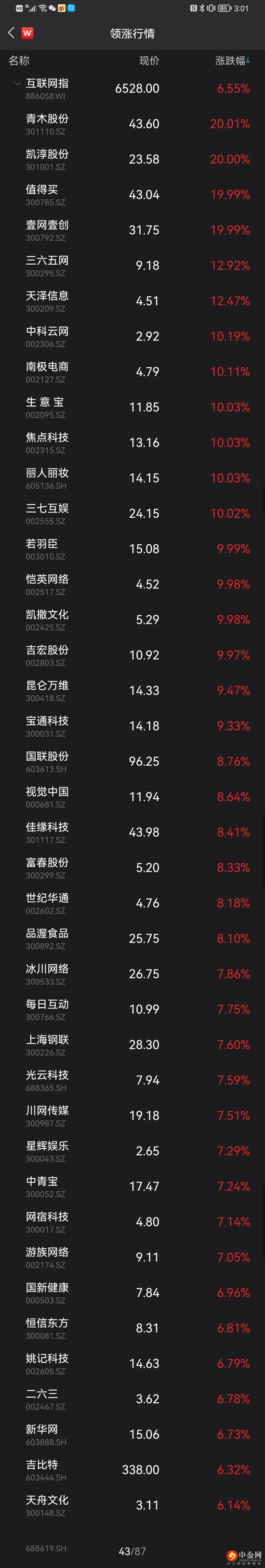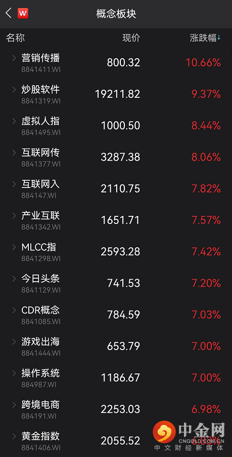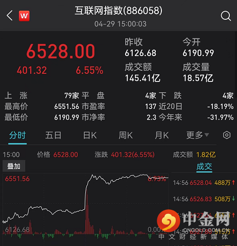 首先沸腾的要数互联网版块。午后,互联网板块直线拉升,收涨6.55%。