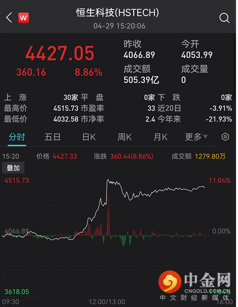 恒生科技大涨超8.8%