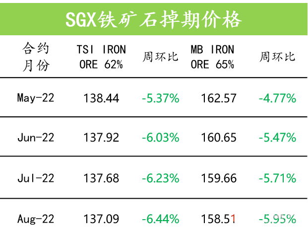 1、4月下旬,重点统计钢铁企业共生产粗钢2358.67万吨、生铁2041.27万吨、钢材2293.47万吨。其中,粗钢日产235.87万吨,环比增长5.50%;生铁日产204.13万吨,环比增长4.35%;钢材日产229.35万吨,环比增长6.43%。2、安赛乐米塔尔发布2022年第一季度运营报告:一季度自有铁矿石产量为1200万吨,环比减少10.45%,同比减少9.77%。其中加拿大和利比里亚地区自有铁矿石产量为690万吨,环比减少4.17%,同比减少5.48%。3、美国商务部出口数据显示:2022年3月美国钢材出口量达76.49万吨,环比增长15.9%,同比增长6.7%。3月其钢铁出口总额为14.3亿美元,同比增长37.5%。4、巴西CSN矿业公司一季度自产铁矿石总产量为644万吨,环比减少7.2%,同比减少23.08%。一季度铁矿石总销量为693.1万吨,环比减少10%,同比减少15.73%。5、2022年3月南非铁矿石出口量为680万吨,环比增长39.4%。2022年一季度,南非铁矿石出口量约为1650万吨,同比基本持平。