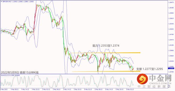 日级别线图,长下影线阴烛,守住1.2300关口,可能出现反弹;15分钟K线,短线出现区间震荡,守住盘整底部,大有可能挑战前高阻力。