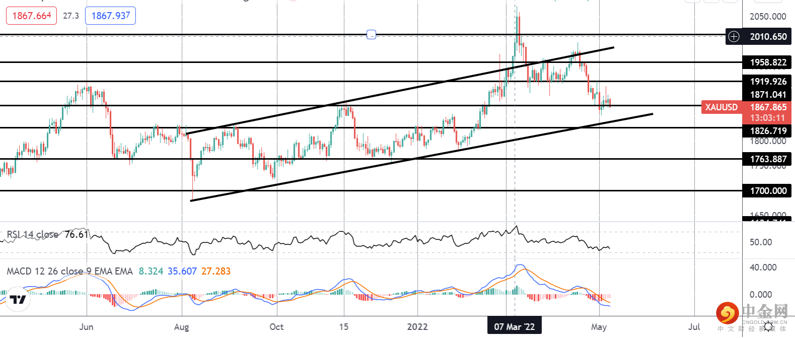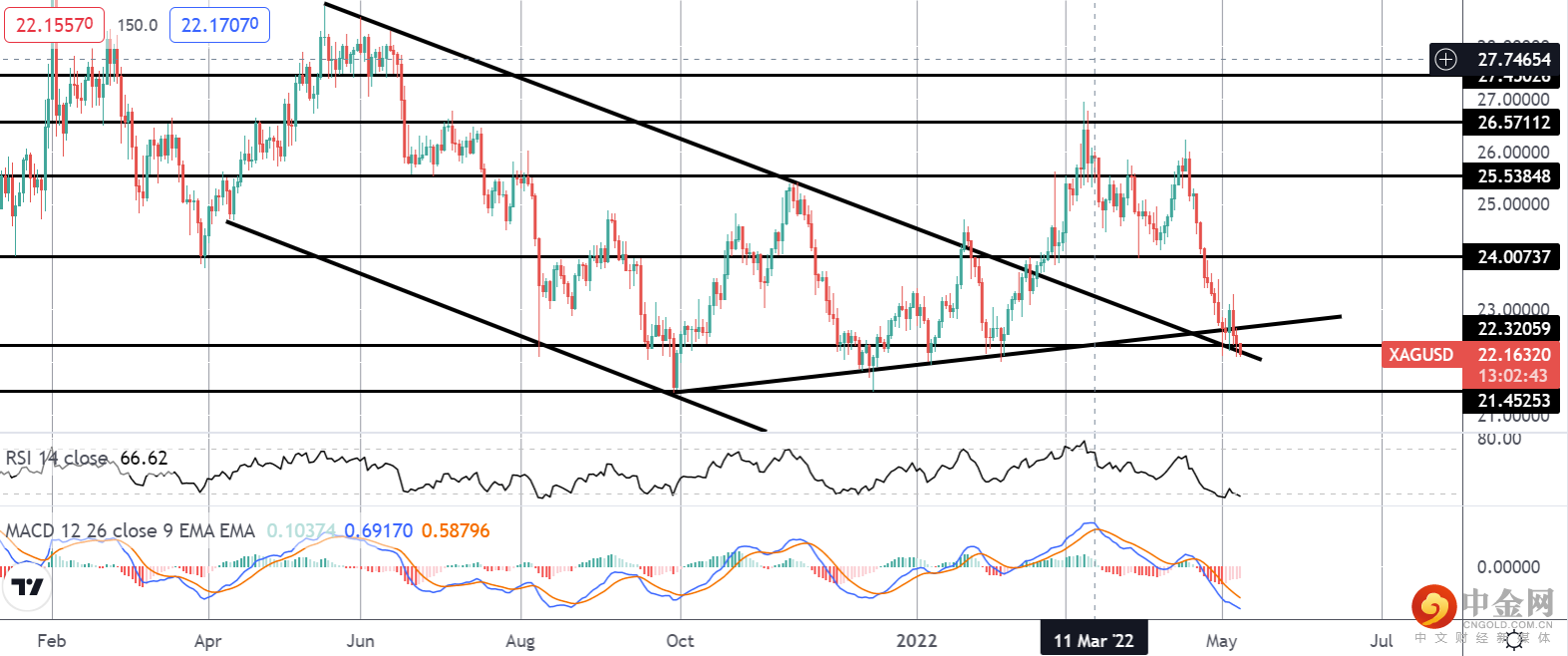 白银价格处于一个非常有趣的技术关口。 市场正在重新测试跌破的熊通道顶部以及从 2021 年第三季度低点开始的上升趋势线支撑。 尽管该区域作为支撑,但进一步向上旋转仍然是可行的。 然而,鉴于 MACD 和 RSI 的看跌读数,如果我们看到下一个支撑位 21.4523 和 19.5643 跌破 22.3205,市场很容易进一步下跌。