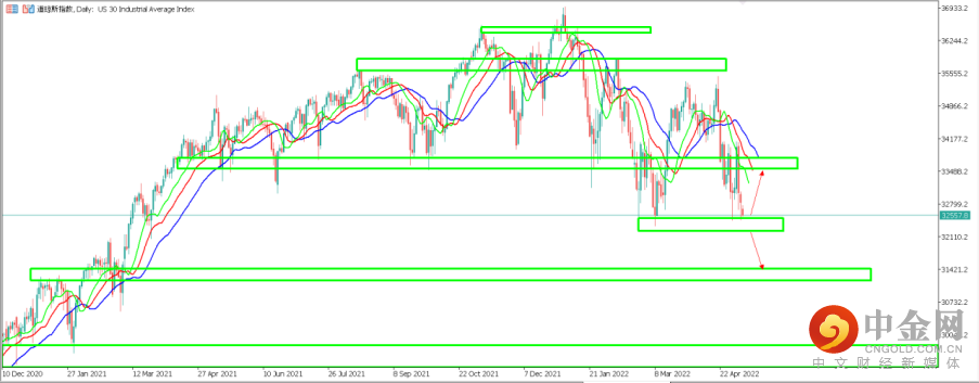 2. 道琼斯指数 (US30):道指上周五再次下跌至前期低点附近,盘中最低触及32470点。从天图周期来看,目前鳄鱼指标呈现空头排列,价格天图重要支撑区间位于32300点附近,如价格在此企稳反弹,有望震荡至上方33600点附近阻力。反之如价格继续向下有效跌破32300点附近支撑,则天图周期下跌趋势将继续延续,价格大概率将朝31300点一线支撑运行。4小时周期来看,价格也是处在下跌趋势中运行,4小时鳄鱼指标可作为短期多空分界参考,如价格持续被鳄鱼指标均线压制,则短期走势依旧偏于悲观。目前价格正位于32560点一线附近运行。