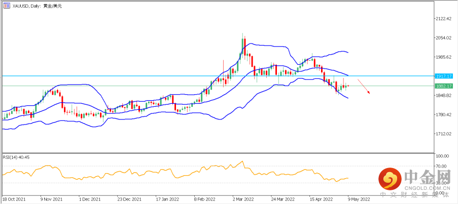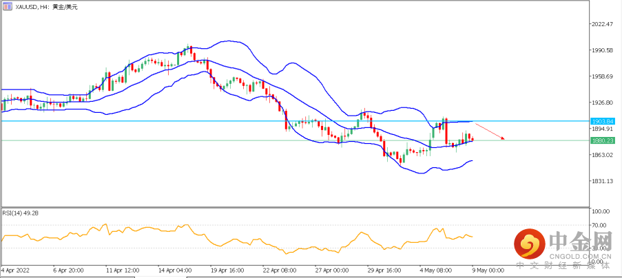 再结合4小时分图,黄金价格目前徘徊在布林带中轨处,日内上方压力位分别位于1890,1896及1903一线,若价格上行遇压力位受阻,则保持看空格局,下方支撑可依次看向1865和1855,短期关键支撑位于日图200日和250日均线重合处1835一线。