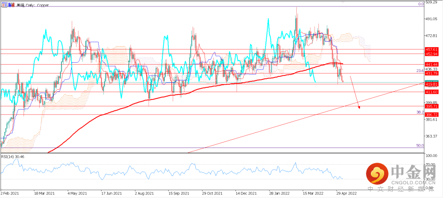 1.美铜(Copper):近期铜价大幅下跌,美铜的价格目前已经跌破了200日均线及Fibo回调线431.8等支撑位,往后展望其价格有较大概率将进一步走弱。