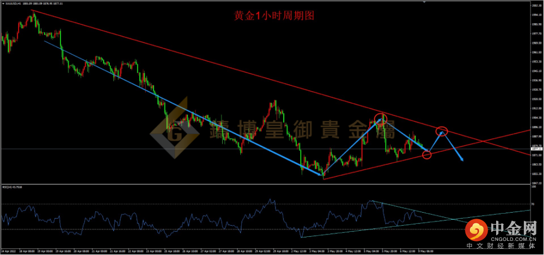 从黄金1小时周期看,自从黄金从2000一线冲高下跌后,一度跌至1850一线,黄金从大周期看仍然处于下跌趋势之中,上周虽然尝试借助消息面反弹,但最终重回跌势,表明行情属于下跌途中的弱势反弹。从结构上看,目前行情处于三角形整理的末端,价格有望在近日出现方向选择,上方压力在1895一线,下方支撑在1870一线,从指标上看,1小时RSI也同样处于三角形整理中,可关注指标破位情况对行情的信号作用。