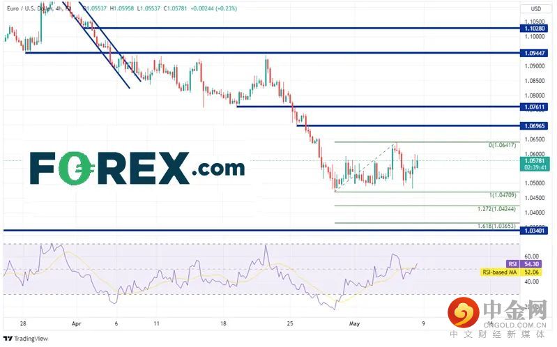 美元指数4小时图仍交投于今天高点附近,上方有4月28日高点到5月5日低点行情的127.2%扩展位1.0435、前述行情的161.8%扩展位1.0490附近、2002年9月以来水平阻力位1.0541(请看日图)。如果价格回撤,第一支撑位在5月5日低点1.0235,然后是水平支撑位101.86和101.03。