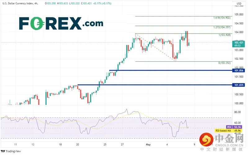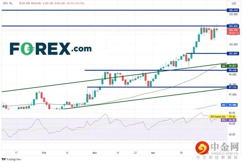 美元指数2021年5月以来有序走高并形成上升通道,于4月初站上通道上轨趋势线所在的99.30附近,然后开始走出抛物线式行情,在4月28日到达20年高点103.93。该指数上周五一度站上103.93,创下2002年12月以来最高点104.06。请注意,RSI处于此前超买区域,得到近期盘整走势的缓解,回到了中性水平。