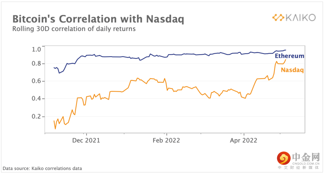 总体而言,自上周FOMC发表利率声明以来,风险资产继续同向移动,比特币与以科技股为主的纳斯达克100指数的滚动相关性刚刚达到0.8的历史高位。其与以太坊的传统强相关性也在上升,目前徘徊在0.9左右。