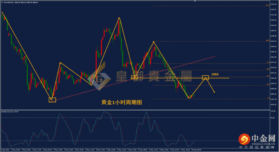 从黄金1小时周期来看,昨日黄金陷入震荡下行的趋势结构当中。亚欧盘时段沿着小周期的均线持续阴跌。昨日最低跌至1851.5附近,短期得到支撑并反弹。目前来看,黄金的下跌趋势并没有得到改变,弱势依旧。黄金Stoch技术指标已经处于20下方并形成金叉。预计短期黄金会有反弹。但反弹后触碰上方压力位后回落的概率依旧较大,投资者可以关注本轮下跌0.382的压力位1866.0附近,建议投资者尝试在此位置布局空单。