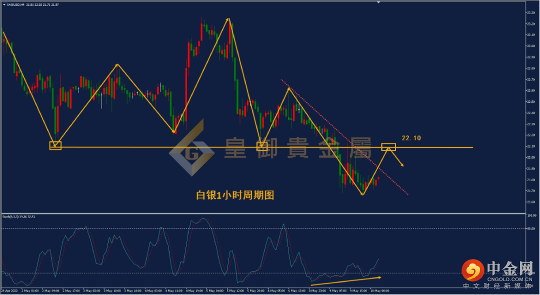 从下方白银1小时周期图看,白银受到下跌趋势线压制震荡下行。目前来看,白银依旧处于弱势格局当中,短期反弹后依旧是空单进场的好机会。但目前白银下跌幅度较大,短期指标需要得到修复。Stoch技术指标低点在不断抬高,价格却不断新低,这意味着短期会有一波反弹。这波反弹或将突破昨日的下跌趋势线。投资者可以关注上方水平压力位22.10附近的压力,后期反弹至此后回落概率较大,建议投资者尝试在此位置布局空单。