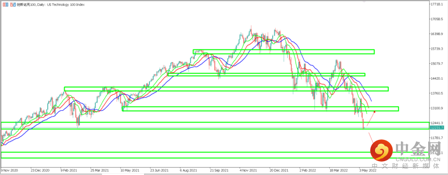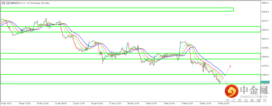 1.NAS100 (纳斯达克100指数):纳指昨日继续大幅下跌,盘中最低触及12136点附近。从天图周期来看,目前纳指依然运行于下行趋势中,天图鳄鱼指标呈现空头排列,价格脱离13000点整数关卡后迅速来到下一支撑区间12200点附近。如价格在12200点区间得到支撑,有望反弹回测13000点阻力区间。反之如价格继续顺势跌破12200点附近支撑,则下一支撑区间位于11100附近。短期1小时周期来看,纳指目前完美沿鳄鱼指标下跌,鳄鱼指标成为完美多空分界。短期如价格成功站上鳄鱼指标均线之上,则趋势可能发生改变,反之如价格持续被鳄鱼指标压制,则短期下跌或将继续。目前价格正位于12218点一线附近运行。