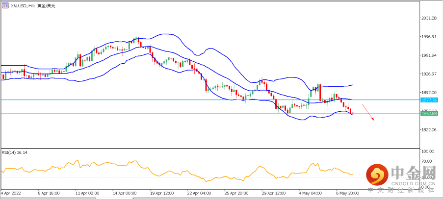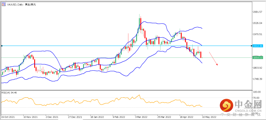 2. XAUUSD (黄金):黄金昨日收跌,创最近一周最大单日跌幅。目前日图大结构上,黄金走势依旧偏空,上方反弹强压力带位于1875-1885区域。再结合4小时分图,黄金日内关键压力位于布林带中轨1875-1880区域,若价格依旧位于该压力带下方运行,则继续看空格局,日内下方潜在目标位于1830-1835区域。请注意,若价格跌破1830-1835区域,则后市可能将测试1800整数关口。数据方面,明日北京时间晚间20:30美国4月通胀数据将为重要的推动力。