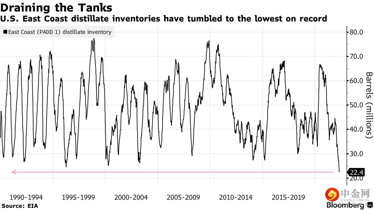 最新的EIA报告显示汽油库存连续第五周下降。上周东海岸的柴油库存已跌至有纪录以来的最低水平,这推动美国馏分油的总体库存(主要包括用作运输燃料和供暖的柴油)降至14年来的新低。