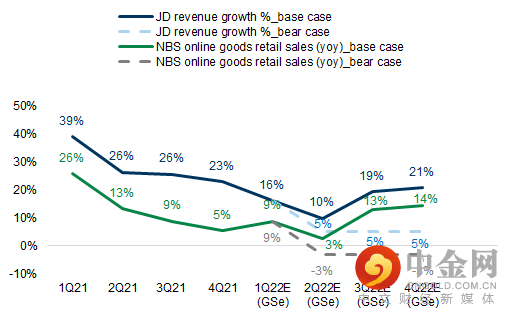 投资者关注的焦点可能是第二季度和第22财年收入增长指引、京东零售和集团利润率前景。投资者将关注管理层对以下问题的评论:(1)在采购规模、广告和3P市场类别的帮助下,京东零售细分市场的利润率继续保持健康趋势的任何重申;(2)在推动增长方面,京东零售市场份额的持续增长,特别是在超市类别,(3)京东物流的投资规模。对达达集团的投资和新业务投资缩减,特别是京喜拼拼。高盛对第二季度-第四季度进行了熊市情景分析(见下图),假设在第三季度-第四季度出现周期性封锁,与上海的情况类似,估计第二季度收入增长5%(在熊市情景下,NBS在线零售商品销售额为-3%),并延伸到第三季度-第四季度。在基本情况下,高盛预计收入同比增长10%,包括产品/服务净收入9%/22%,京东零售利润率为2.7%(+10bp),去年为2.6%(意味着全年京东零售利润率3.1%,与21财年持平),21年第二季度调整后集团净利润率1.4%(2021财年为1.8%)。高盛基于sotp估值法将京东集团12个月目标价从109美元/425港元下调至102美元/399港元,维持买入评级。