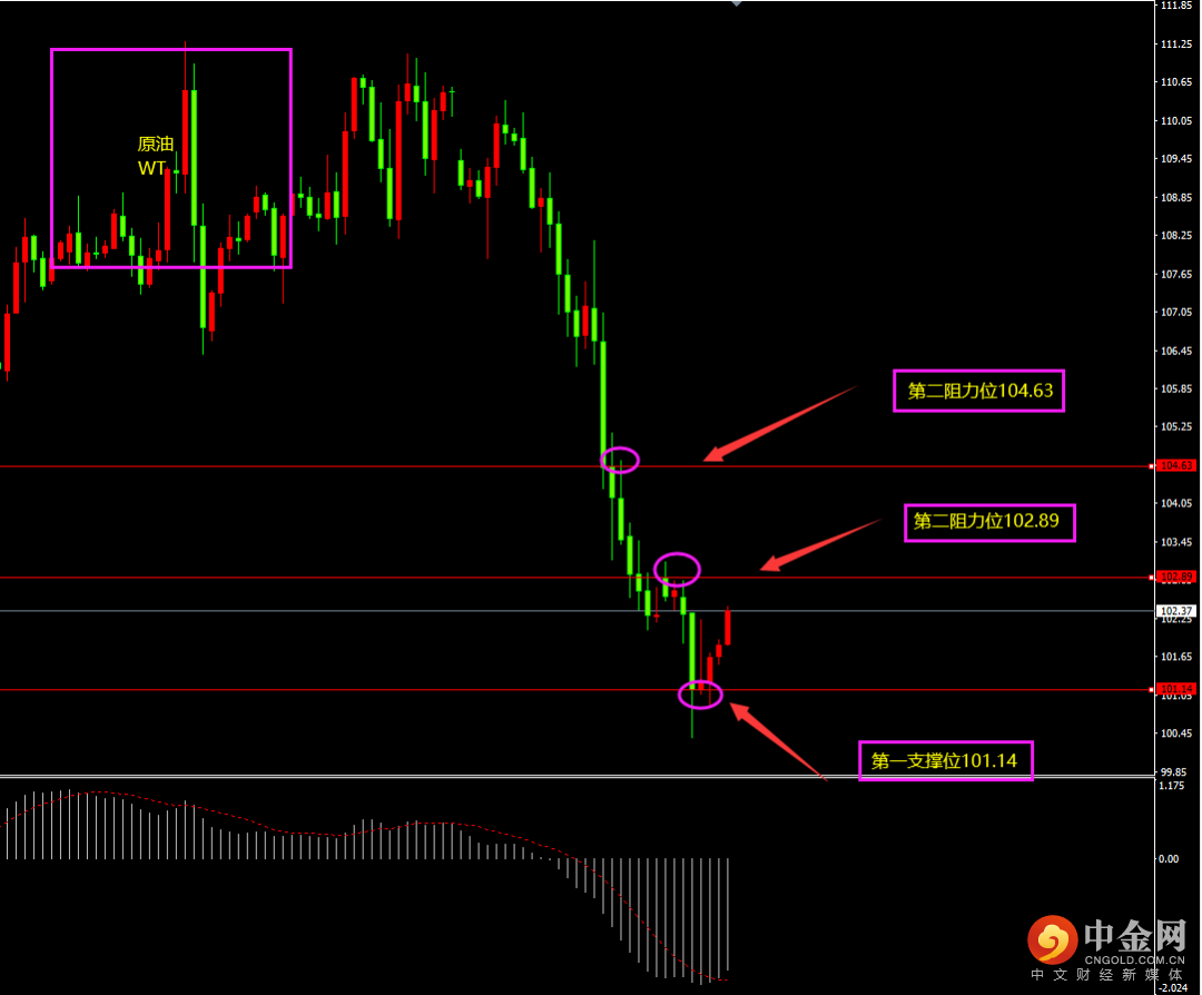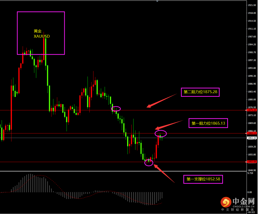 天图黄金收大阴线,价格大幅回落,空头得到大量释放,短期价格重心仍处在上移阶段,多头仍在,且走弱后面临调整,日内更多以逢低看多为主。小时图黄金期间下行幅度放缓,MACD逐渐上移,空头有所减弱,底部有连续阳线拉升,多头有所增强,日内更多以震荡以及震荡上行为主?