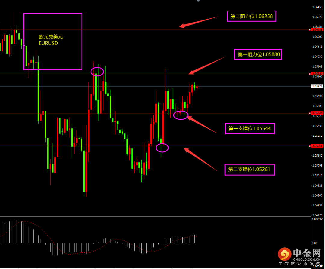 天图欧元收小阳线,价格小幅冲高,多头有所增强,短期震荡低位未破,且MACD逐渐上移,空头持续减弱,日内更多以震荡以及震荡上行为主?小时图欧元期间连续阳线拉升,MACD转移至0轴之上,多头占优,目前上方虽有部分阴线回落,但更多视为调整,调整之后继续以逢低看多为主?