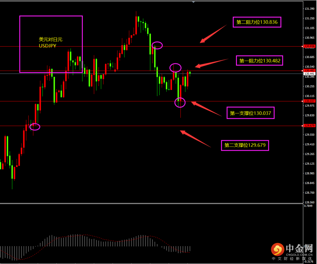 天图美日收阴线,上影线较长,价格曾一度冲高后大幅回落,多头上行力度大幅减弱而空头增强,短期上方阻力未破,空头占优,日内更多以逢高看空为主。小时图美日期间连续阴线回落,MACD位于0轴之下,空头占优,短期底部虽有连续阳线拉升,但更多视为调整,日内更多以逢高看空为主?