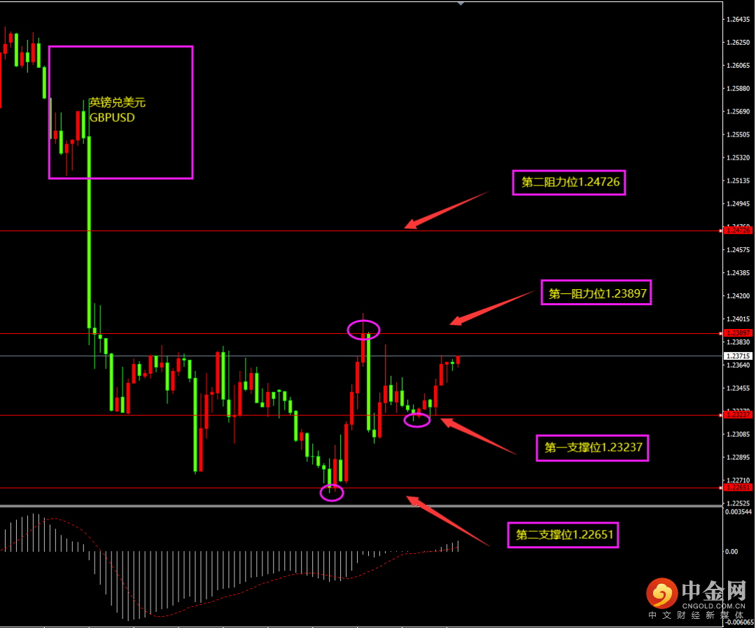 天图英镑收十字线,多空低位博弈,短期下影线较长,价格一度下滑之后反弹,空头遭受多头反扑,多头增强,日内更多以逢低看多为主?小时图英镑期间低位震荡,期间连续阳线拉升,MACD转移至0轴之上,多头占优,短期上方虽有大阴线,但更多视为回调,日内更多以逢低看多为主?