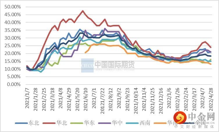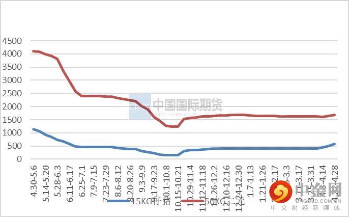 4月中旬开始,猪价开始快速上涨,最高价14.71元/公斤,最低价12.02元/公斤。地区最高的是广东,最高达到16元/公斤。本轮涨价更多是受到分区调运管控的影响,两广地区率先涨价,周边地区跟涨,北方地区也跟涨。此轮上涨基础并非完全是基本面改善,因此后期不排除出现回调情况。