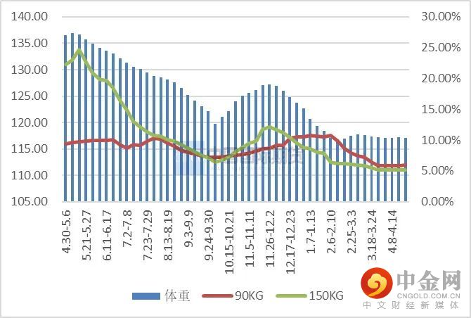 4月全国出栏平均体重维持在117公斤左右,较3月略降,150公斤以上出栏约占5.80%,与3月基本持平,养殖端主动压栏现象较少,基本上顺势出货;90公斤以下出栏猪占比下降,主要由于天气转暖,非瘟等猪病发病率降低。随着后期天气转热,市场对肥猪需求减少,预计生猪出栏体重会继续下调。