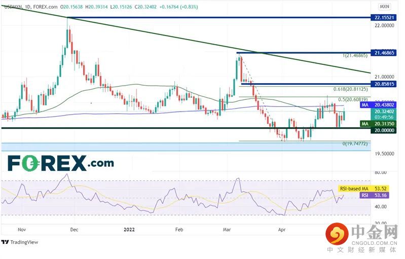 美元/墨西哥比索日图再度试图反攻,只是受制于三角形的下降趋势线。价格从3月8日的近期高点21.4686回撤至19.7477低点后到达50%回档位与支撑位,目前交投于50天移动均线和200天均线之间,即20.3135 - 20.4380区间。如果站上200天均线,可能上看4月28日高点阻力20.6380。如果攻克,或先后涨至61.8%回档位20.8112、水平阻力位20.8582。如果受制于50天均线,则可能下看前低点兼心理整数位20.00和4月4日以来低点19.7477、周图支撑区域19.5980 - 19.9068。